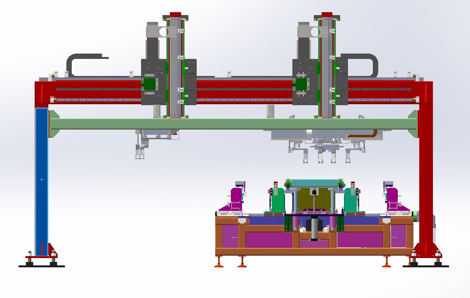 自動(dòng)排版機(jī)的主要功能單元有:玻璃輸送定位系統(tǒng)、抓取行走系統(tǒng)、視覺(jué)檢測(cè)系統(tǒng)、電控系統(tǒng)等;通過(guò)以上功能單元,實(shí)現(xiàn)了將自動(dòng)串焊機(jī)串焊好的電池串,按照工藝尺寸要求和排版方向順序自動(dòng)排版鋪設(shè)到玻璃(EVA已經(jīng)鋪設(shè))上,組成電池串陣列。玻璃/EVA通過(guò)傳輸線(xiàn)傳輸至指定位置,機(jī)械手抓取電池串實(shí)現(xiàn)CCD定位、自動(dòng)旋轉(zhuǎn)、自動(dòng)排版功能。設(shè)備通過(guò)同步帶傳輸與自動(dòng)生產(chǎn)線(xiàn)對(duì)接,實(shí)現(xiàn)了自動(dòng)流水作業(yè)。